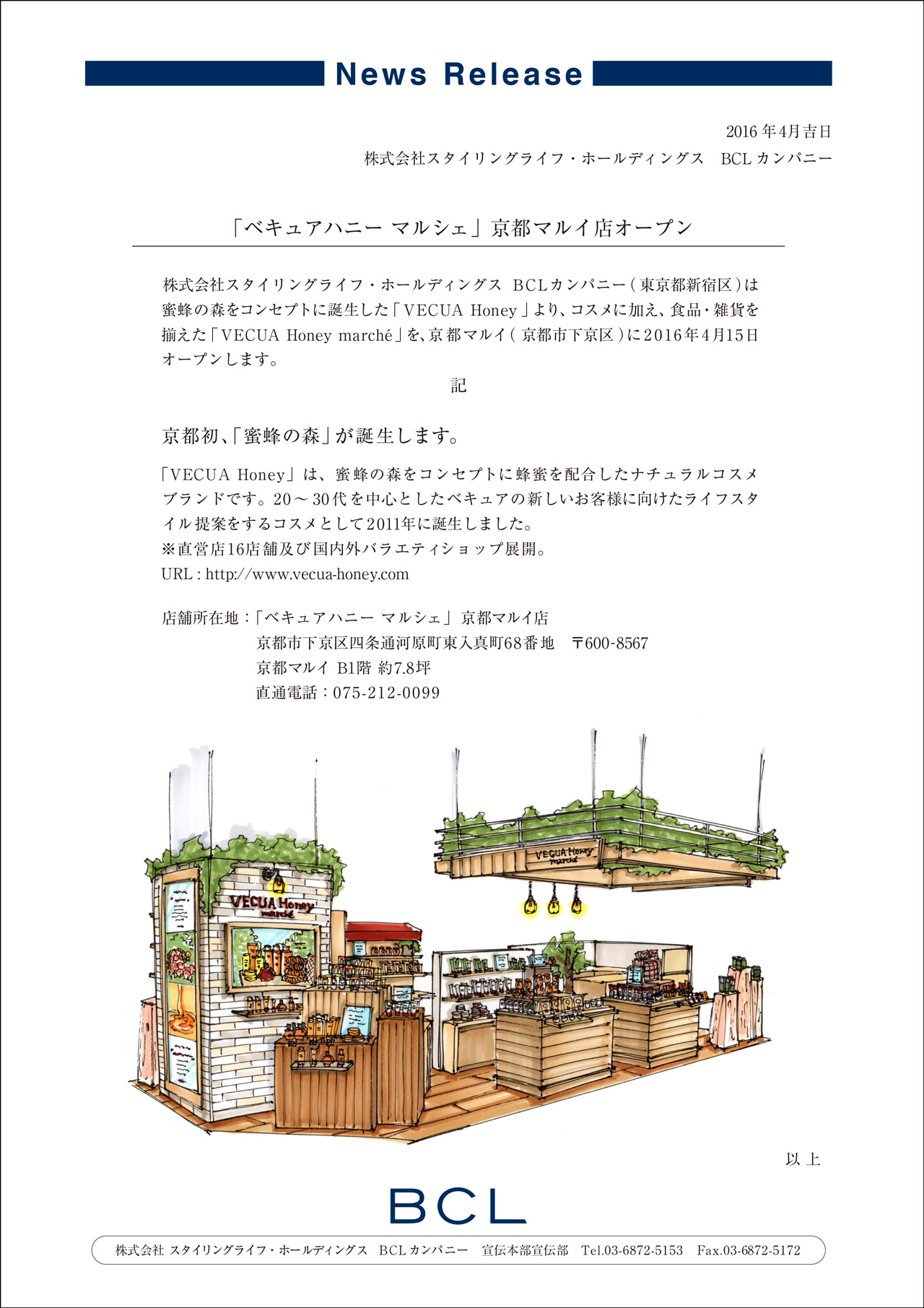 株式会社スタイリングライフ・ホールディングス BCLカンパニー(東京都新宿区)は蜜蜂の森をコンセプトに誕生した「VECUA Honey」より、コスメに加え、食品、雑貨を揃えた「VECUA Honey marché」を京都マルイ(京都市左京区)に、2016年4月15日にオープンします。