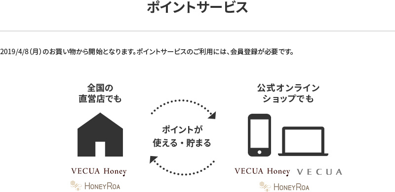 2019年4月8日より、VECUA Honey・HONEY ROAの直営店、VECUA Honey・VECUA・HONEY ROAの公式オンラインショップ共通で、ポイントが貯まる・使える新サービスを開始いたしました。