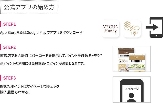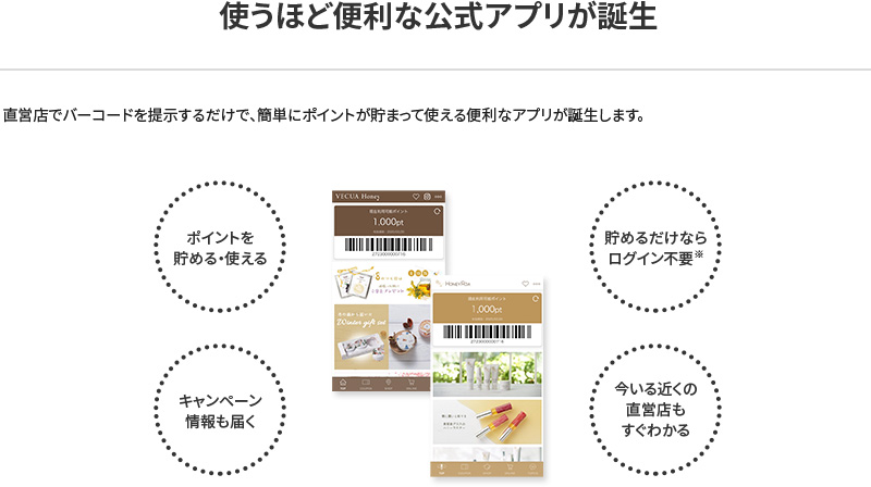VECUA Honey・HONEY ROAでは直営店でバーコードを提示するだけで簡単にポイントが貯まって使える便利な公式アプリをリリースいたしました。ぜひダウンロードしてお楽しみください。