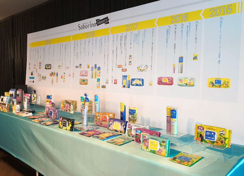 サボリーノ が生まれた2015年から「サボリーノ オトナプラス 夜用チャージフルマスク」が生まれる2019年秋までの全アイテムの展示もいたしました。