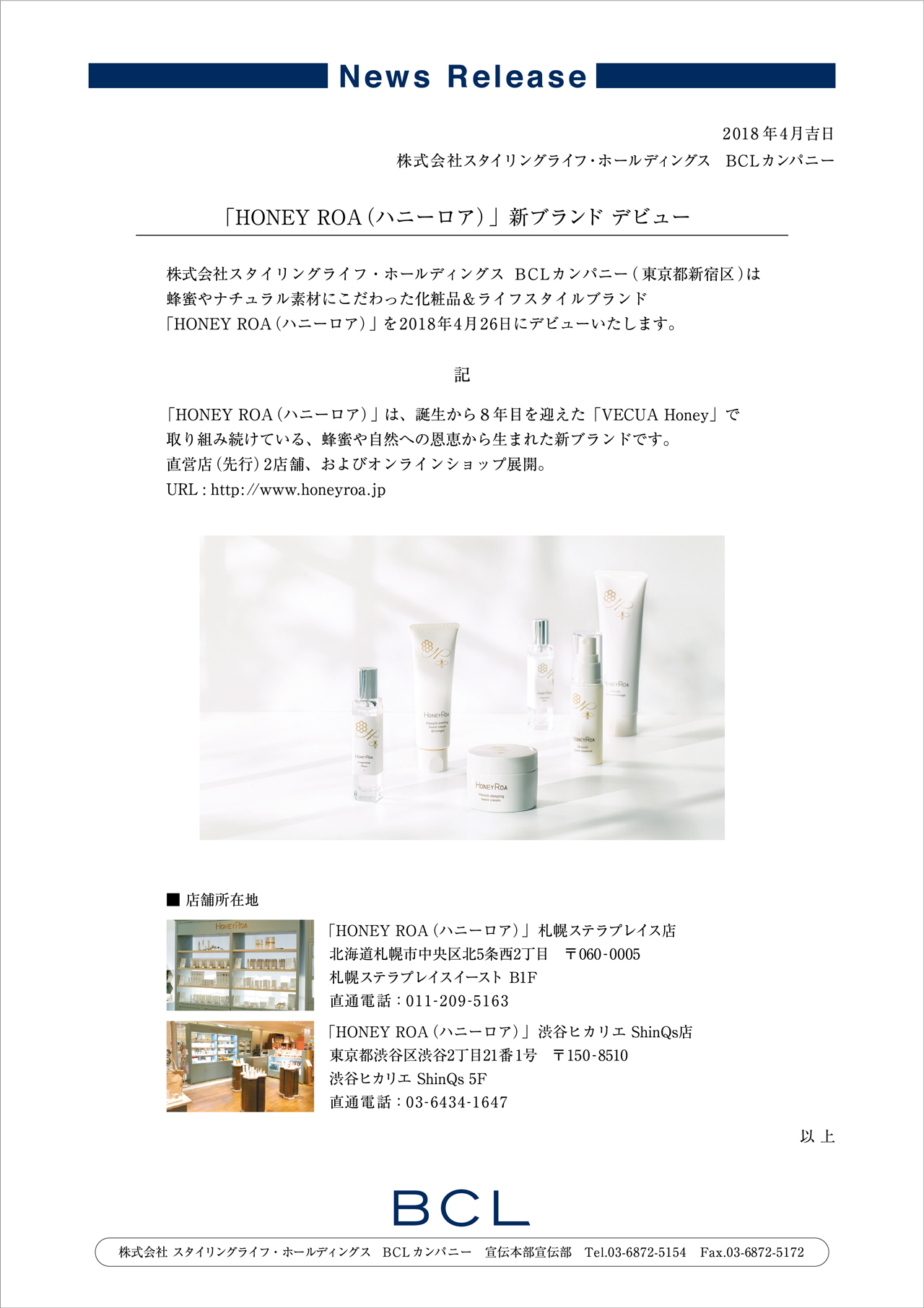 株式会社スタイリングライフ・ホールディングス BCLカンパニー(東京都新宿区)は蜂蜜やナチュラル素材にこだわった化粧品&ライフスタイルブランド