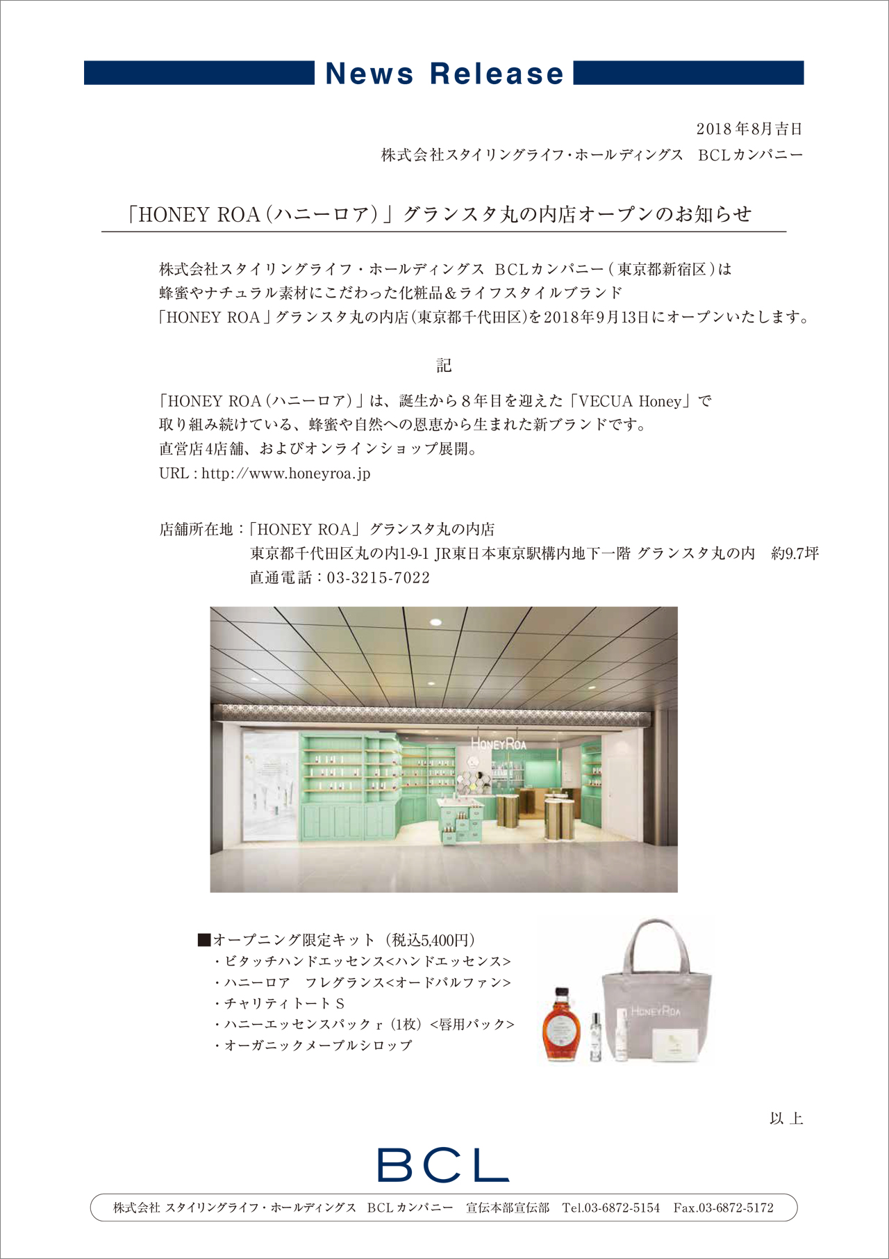 株式会社スタイリングライフ・ホールディングス BCLカンパニー(東京都新宿区)は蜂蜜やナチュラル素材にこだわった化粧品&ライフスタイルブランド「HONEY ROA」グランスタ丸の内店(東京都千代田区)を、2018年9月13日にオープンいたします。