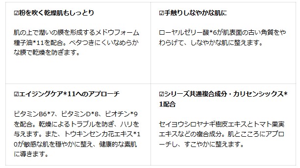 *1 グリセリン、水、トマト果実エキス、セイヨウシロヤナギ樹皮エキス、マルトデキストリン、シリカ(整肌成分) *6 10-ヒドロキシデカン酸(整肌成分) *7 ピリドキシンHCl(整肌成分) *8 コレカルシフェロール(整肌成分) *9 整肌成分 *10 整肌成分 *11 エモリエント成分